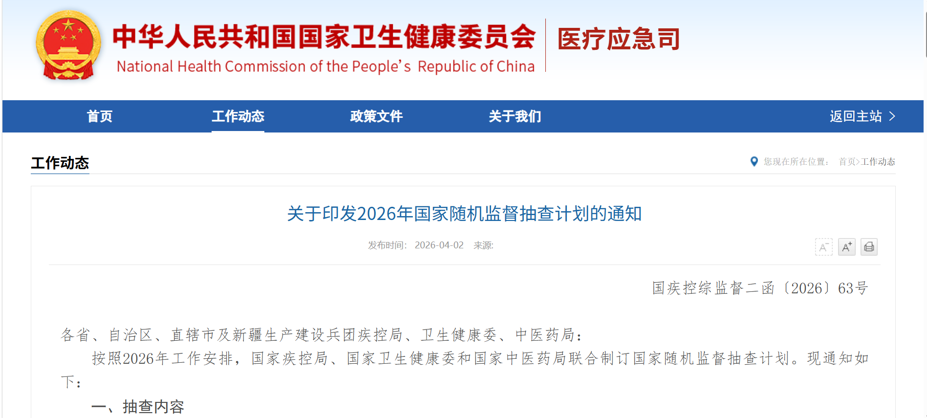 按照2026年工作安排,国家疾控局、国家卫生健康委和国家中医药局联合制订国家随机监督抽查计划。现通知如下: